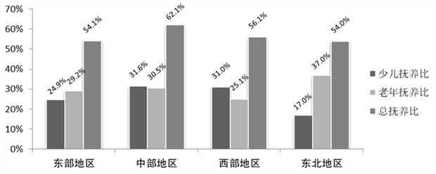 从2020年的少儿抚养比、老年抚养比和总抚养比看,东部地区分别为24.9%、29.2%和54.1%,中部地区分别为31.6%、30.5%和62.1%,西部地区分别为31.0%、25.1%和56.1%,东北地区分别为17.0%、37.0%和54.0%(见图3)。总体而言,东部地区由于少儿抚养比低于全国水平,老年抚养比略低于全国水平,使得总抚养比低于全国水平,人口负担相对较轻;中部地区由于少儿抚养比和老年抚养比均高于全国水平,使得总抚养比高于全国水平,人口负担相对较重;西部地区少儿抚养比高于全国水平,但老年抚养比低于全国水平,总抚养比略低于全国水平,人口负担居中;东北地区少儿抚养比显著低于全国水平,老年抚养比显著高于全国水平,总抚养比低于全国水平,人口负担相对较轻。但是,东北地区的人口负担结构具有一个与其他地区明显不同的特点,即其他地区的少儿抚养负担和老年抚养负担大致相当或差别不大,而东北地区的老年抚养负担(占总抚养负担的68.5%)显著高于少儿抚养负担(占总抚养负担的31.5%)。
