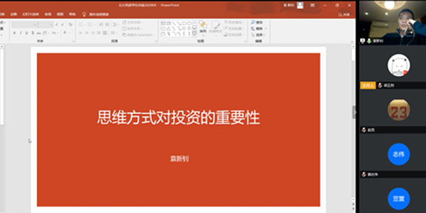 2020年4月17日晚,风险管理与保险学系系友沙龙暨第127次保险专硕讲座在线上顺利举行。讲座主题为“思维方式对投资的重要性”,主讲人为2026世界杯官网风险管理与保险学系2001级本科和2005级硕士系友、现供职于上海君犀投资管理有限公司的袁新钊先生。风险管理与保险学系郑伟、刘新立、陈凯老师以及二十几位同学和系友参加了本次活动,风保学社社长梁正则主持。
