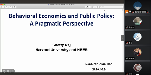 2020年10月9日上午,第90次RMI读书讨论会在腾讯会议线上举行。风险管理与保险学系2018级博士生韩笑就哈佛大学经济学教授Chetty Raj发表在American Economic Review上的论文“Behavioral economics and public policy: A pragmatic perspective”与大家进行了交流,风险管理与保险学系部分师生参加本次活动。