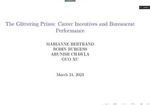 首先,李明蔚介绍了文章的研究话题。在官僚体系中,由于缺乏绩效工资、解雇等手段,升迁是主要的官员激励手段。然而,僵化的晋升制度使得年长时入职的官员缺乏努力工作的动力,因为他们在退休前不太可能被提拔进入官僚机构的高层。
