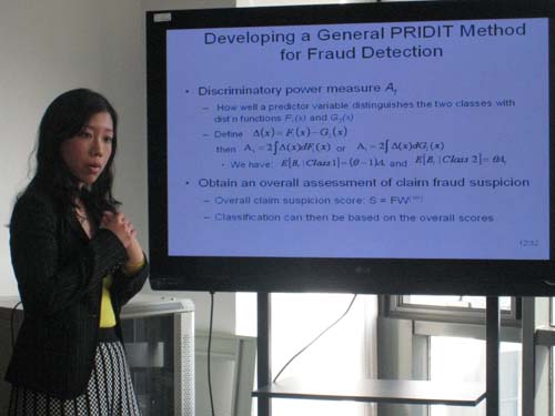 艾菁博士从保险欺诈的定义入手,说明了保险公司设计保险欺诈识别和防范方法的重要性。保险欺诈可以从法律和公司实际运行两个方面来定义;法律的定义常常并不适用于保险公司的具体识别行为,因此保险公司需要设计一个机制来判别保险欺诈并予以防范。在传统的识别方法中,保险公司常常会给各个赔案一个评分,并根据评分决定对赔案的归类。但是这一方法带有太多主观性,而且会给保险公司带来很高的评估成本。就此,艾菁博士及其合作者研究了更加客观、成本更低的方法。由于在现实中,一个赔案是否属于欺诈的数据不易获得,即便能获得也不一定准确,因而新方法的模型没有采用回归的形式,而是只考虑影响保险欺诈的自变量,在“保险欺诈是否存在”这一因变量难以取得的情况下,可以节省大量的数据采集成本,从而使得新方法具有更强的适用性。