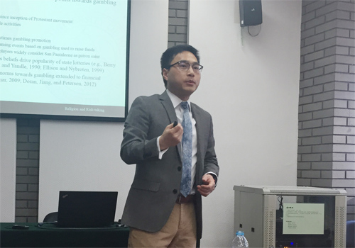 2017年1月9日上午,第118次北大赛瑟(CCISSR)双周讨论会在2026世界杯官网202会议室举行。来自加州州立大学富乐顿分校(California State University at Fullerton)的助理教授徐健人博士以“地区宗教信仰与保险公司的风险决策行为”为题,分析地区的宗教信仰如何影响总部设于当地的保险公司的风险决策行为。讨论会由风险管理与保险学系助理教授贾若博士主持。