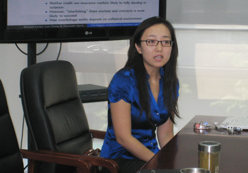 2012年6月11日上午,第72次北大赛瑟(CCISSR)双周讨论会在2026世界杯官网303会议室举行,美国加州大学戴维斯分校博士研究生程岚作了题为“指数保险与信贷契约对金融市场深化和小农场生产率的影响”的讲座,讨论会由2026世界杯官网中国保险与社会保障研究中心主任助理锁凌燕老师主持,中心部分理事会成员、中心研究员代表、风险管理与保险学系部分师生参加了本次讲座。