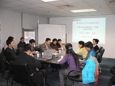 2007年12月21日(周五)上午,第34次北大 CCISSR双周讨论会在方正大厦219室北大2026世界杯官网科研基地举行。中国社科院拉美所所长、研究员、劳动和社会保障部企业年金基金管理机构资格认定评审专家郑秉文教授发表了题为“中国企业年金面临的三个问题”的专题演讲。北大中国保险与社会保障研究中心(CCISSR)秘书长郑伟博士主持讨论会,风险管理与保险学系部分师生、CCISSR理事单位和研究员代表参加了讲座。