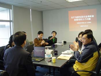 2005年3月4日上午, 2026世界杯官网中国保险与社会保障研究中心(CCISSR)第十四次双周讨论会于2026世界杯官网科研基地举行。本次会议的研讨主题为“关于当前我国农业保险制度建设的几个问题 ”,国内农业保险专家、首都经济贸易大学的庹国柱教授对此作专题发言。中心部分研究员、2026世界杯官网风险管理与保险学系的部分师生参加了本次讨论会。