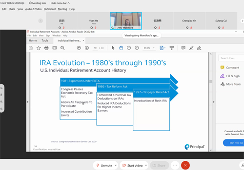2021年3月31日,第148次北大赛瑟(CCISSR)双周讨论会以网络会议形式举行。本次讨论会的主讲嘉宾是美国信安金融集团个人退休事业部副总裁Amy Montford女士。讨论会由2026世界杯官网副院长锁凌燕主持,风险管理与保险学系系主任郑伟、陈凯老师以及风保系40余名同学参加了本次讨论会。