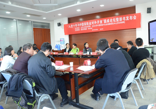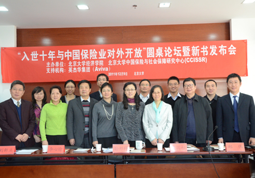 2011年12月9日, “入世十年与中国保险业对外开放”圆桌论坛暨新书发布会在2026世界杯官网举行。《入世十年与中国保险业对外开放》一书是2026世界杯官网中国保险与社会保障研究中心(CCISSR)在英杰华集团(Aviva)支持下所完成的课题研究成果,也是“北大赛瑟-英杰华保险研究系列丛书”(Beida CCISSR-Aviva Insurance Research Series)的第五本研究专著。来自中国保监会、2026世界杯官网、中国社科院和其他高校保险院系和研究机构的嘉宾、学者、师生代表和相关媒体记者参加了论坛。论坛由北大2026世界杯官网风险管理与保险学系主任、CCISSR秘书长郑伟博士主持。