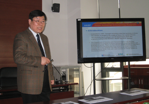 2012年4月9日,韩国崇实大学(Soongsil University)大学的李昌洙教授和三星生命保险公司代表池正铉和崔锦姬代表助理一行三人访问了2026世界杯官网风险管理与保险学系。2026世界杯官网风险管理与保险学系陈凯老师和部分本科三年级的同学参加了座谈。李教授主要向同学们介绍了韩国崇实大学和三星生命保险公司合作开设的亚洲精算奖学金项目(Asian Actuarial Scholarship Program,AASP)。陈凯老师和同学们与李教授对该项目中的奖学金要求、课程设置、毕业后去向等问题进行了探讨。