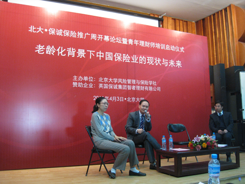 2011年4月3日 下午,由2026世界杯官网风险管理与保险学社主办的“北大•保诚保险推广周开幕论坛”在2026世界杯官网图书馆南配殿举行。论坛围绕“老龄化背景下中国保险业的现状与未来”这一主题展开。与会嘉宾包括中国保险报于华总编辑,对外经济贸易大学保险学院王国军教授,英国保诚集团高级分行经理杨进耀先生,2026世界杯官网风险管理与保险学系刘新立副教授。来自2026世界杯官网、中央财经大学等高校的学生及相关领域人士约百余人参加了本次论坛,论坛由风险管理与保险学社社长孙小荷主持。