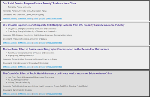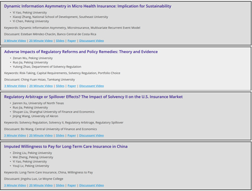 会议期间,在“信息不对称”分会场,姚奕副教授宣讲了论文《小额健康保险中的动态信息不对称:对可持续性的启示》(合作者:张晓奇、陈仪),并担任同会场论文的点评人。贾若副教授的合作论文《监管改革和政策补救措施的不利影响:理论和证据》(合作者:吴泽南、赵宇龙)、《监管套利或溢出效应?偿付能力II对美国保险的影响》(合作者:刘淑彦、王瑾景、徐健人),分别在“保险公司经营”和“监管、偿付能力及公共政策”分会场宣讲。其中,《监管套利或溢出效应?》一文荣获Harold D. Skipper 2020 亚太风险与保险学会最佳会议论文奖。