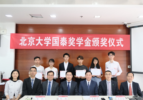 接下来,陆家嘴国泰人寿北京分公司总经理丁业超宣读了获奖证书,国泰人寿北京代表处首席代表王政传先生作为颁奖嘉宾为获奖同学们颁奖。获得本年度国泰奖学金的同学包括本科生王奕然、毛董琴、曹璇、吴子强,硕士生梁雅诗和博士生谢志伟。颁奖仪式完成后,全体获奖同学与参会嘉宾、老师合影留念。