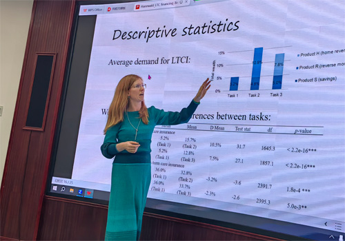 Katja Hanewald教授作了题为《住房流动性与长期护理保险需求:来自中国的调查证据》的发言。在人口老龄化日益严峻的背景下,长期护理服务需求日益增长,但是基本健康保险通常只覆盖基本的长期护理服务费用,同时只有极少数国家建立了公共性质的长期护理保险制度,导致长期护理服务的自付比例较高。考虑到房产通常在家庭财富中占比最高但流动性差,且多数老人更加偏好居家养老,她及团队使用调查的方法,研究当允许个人使用房产财富时,其对长期护理保险的需求,以及影响长期护理保险需求的因素。结果表明,当个人可以使用房产财富和储蓄购买长期护理保险时,长期护理保险需求增加;当个人可以通过反向抵押贷款而非通过降低住房水平获得财富时,长期护理保险需求更高。