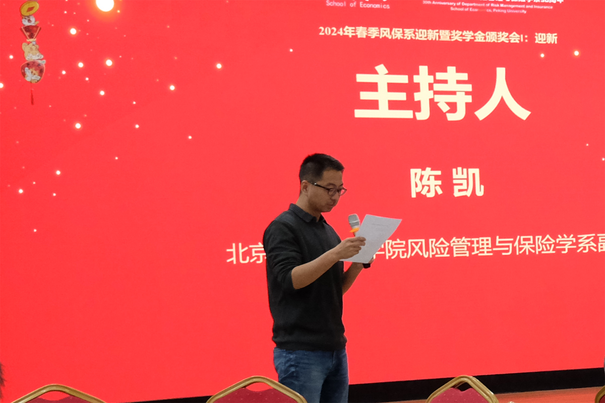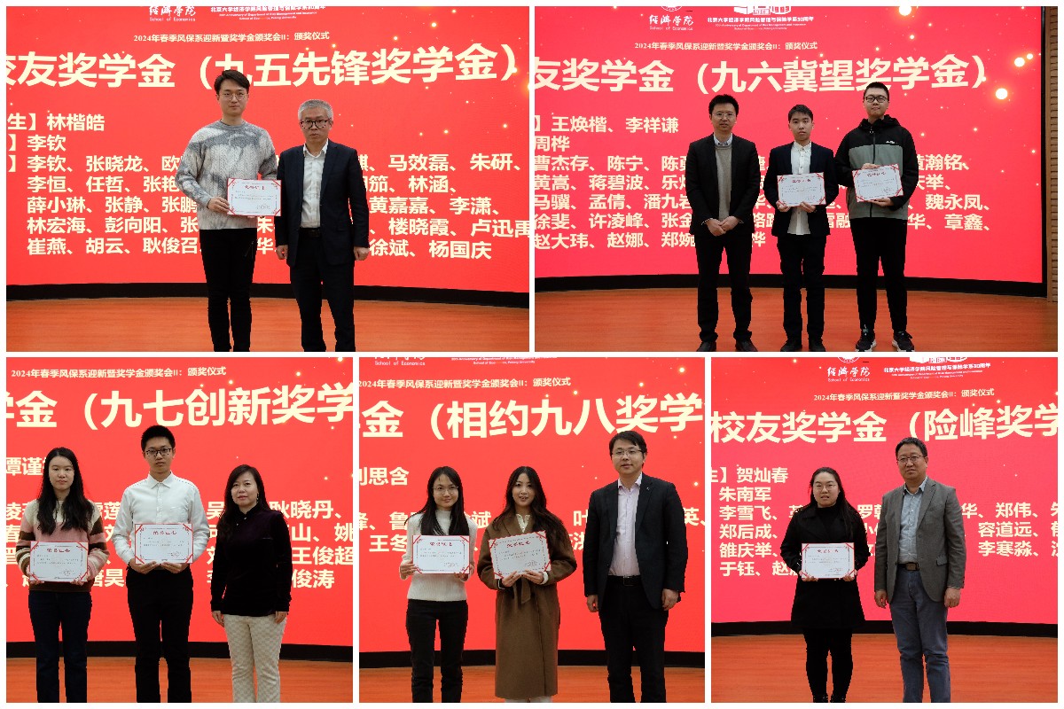 2024年3月1日下午,北大2026世界杯官网风保系2024年迎新暨奖学金颁奖会在2026世界杯官网B103会议室举行。风保系首任系主任孙祁祥老师、捐赠系友代表95级李钦、96级周桦、97级李建华和98级幸科作为特邀嘉宾出席会议,与在校师生进行经验分享并为获奖同学颁发奖学金。风保系全体老师和在校本科、研究生参加了此次活动。风保系副主任陈凯老师主持会议。