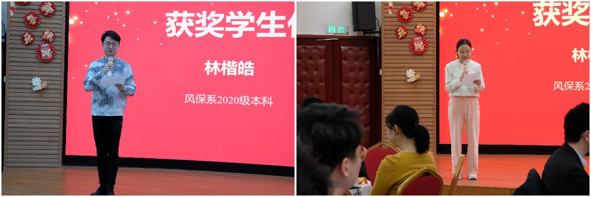颁奖仪式后,林楷皓和汪清宇分别代表本科生和研究生获奖同学发言。他们诚挚感谢学长学姐和老师们的慷慨捐赠,并对风保系对他们的培养和支持表示感激。他们呼吁大家保持热情,承担责任,不负众望,努力前行。通过他们的发言,展现了风保系学生对于学业和未来的热情与决心。