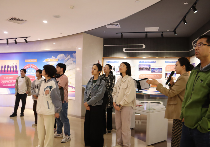 师生一行首先参观了中再大厦二层展厅,了解了中再的历史沿革与发展成就。展览墙上展现的发展成果,让师生们深刻体会到一家大型国有保险企业峥嵘岁月:中再与国同生,经过一系列架构改制、战略实施,成为了服务国家战略、引领行业发展的大型再保险集团;中再始终关注社会发展需要、积极参与国家风险治理、应对大型风险灾害、深度实施科技创新、主动推进国际化布局,并始终坚持党风建设和文化培育。