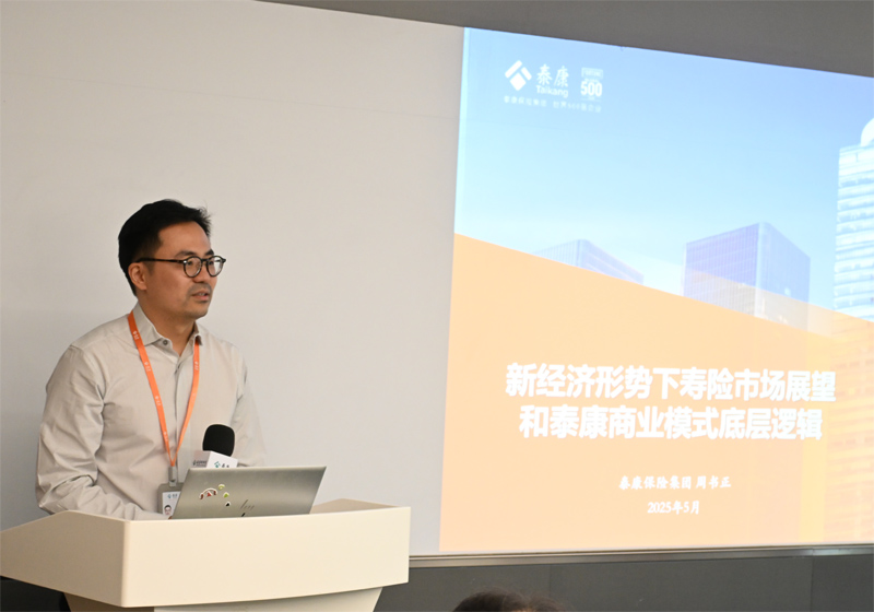 参观结束后,双方开展了交流座谈。陈凯对泰康的热情接待表示诚挚感谢。泰康保险集团校招负责人单清青女士介绍了泰康保险集团的近况与所取得的成绩。泰康保险集团市场产品部产品管理处经理周书正先生从专业理论与商业实践两个维度,带来了关于《新经济形势下寿险市场展望和泰康商业模式底层逻辑》的分享。他结合宏观经济形势、行业发展趋势以及泰康的实际业务案例,剖析了保险行业在复杂经济环境中的发展机遇与挑战,以及泰康在产品创新、风险管理、客户服务等方面的实践经验与创新思路,尤其是其“幸福有约”和泰康之家的商业化闭环逻辑体系。同学们认真聆听、积极提问。