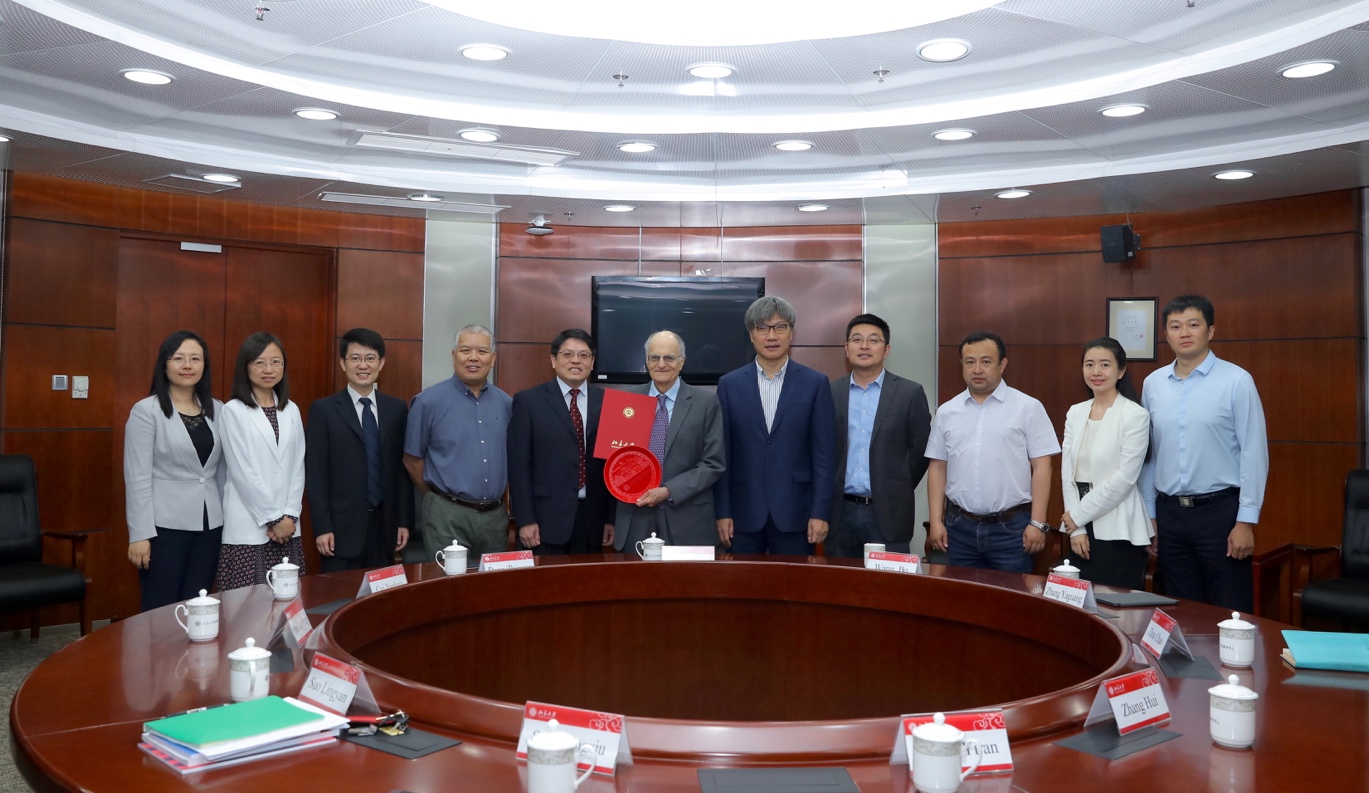 Later, Professor Wang and Professor Dong Zhiyong, Dean of SEPKU, presented Professor Sargent with a certificate and souvenirs. Secretary of the SEPKU Council, Cui Jianhua, Associate Dean of SEPKU, Zhang Hui, Zhang Yaguang, Suo Lingyan, and Qin Xuezheng, Deputy Secretary of the SEPKU Council, Song Fangxiu, and Wang Yiran participated in the ceremony and had a group photo with Sargent.