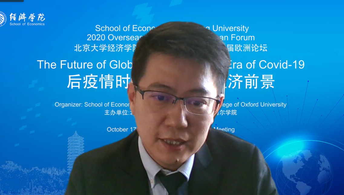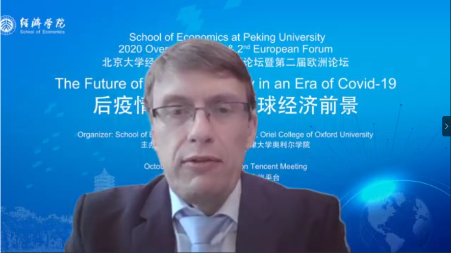On the afternoon of October 17, 2020 Overseas Forum&Second European Forum of the School of Economics at Peking University was successfully held online. This forum was co-organized by School of Economics, Peking University and Oriel College, Oxford University. Under the theme of "THE FUTURE OF GLOBAL ECONOMY IN AN ERA OF COVID-19", the conference discussed in depth the uncertainties of economic development in the post-epidemic era and the new opportunities for cooperation and development among countries around the world.