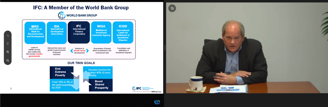 On the afternoon of November 3, 2021, the fifth lecture series on International Organizations and Global Economic Governance of the School of Economics at Peking University was held online. Randall Riopelle, Chief Representative of the World Bank Group International Finance Corporation in China, South Korea and Mongolia, and his colleagues gave a lecture entitled "IFC's Operations and Cases in China". This event was jointly organized by the School of Economics at Peking University and the Talents Office of the International Organization of the Peking University Student Employment Guidance Service Center.