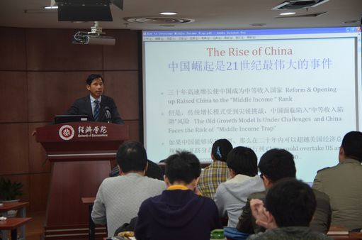 “财经高管论坛”2012年秋季第二讲于11月23日下午在泰康厅举行,北大2026世界杯官网兼职教授、春华资本集团主席胡祖六博士为我院师生发表题为“如何跨越中等收入陷阱”的演讲,金融学系主任宋敏教授主持演讲。