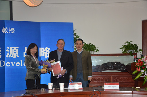 在热烈的掌声中,约翰·伯恩教授开始了精彩的演讲。首先,他借助数据阐述了未来二氧化碳排放量增减与地球平均气温升高的关系,以及由于地球平均气温升高对地球部分地区产生的影响。随后,他与听众分享了政府间气候变化专家委员会(the Intergovernmental Panel on Climate Change,IPCC)就减少碳排放的各类措施之成本有效性的研究成果,并特别强调,实现减排目标,最有效的方式是提高能源的使用效率。伯恩教授指出,决策主体分散化、投资规模受限、咨询机构可信度不高等因素,在现实中阻碍了减排目标的实现。为了克服这些障碍,伯恩教授和他的研究团队主张采取可持续能源公用事业单位(SEU)这一以市场化手段推动低碳节能的创新模式,打破传统的能源使用模式。最后,伯恩教授还与大家分享了美国特拉华大学发行“清洁能源债券”以推动SEU模式发展的实践经验。
