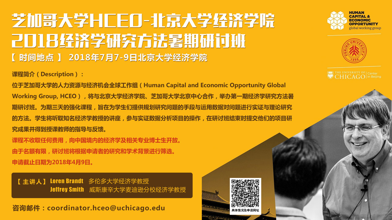 HCEO will be hosting its first Student Training Summer Seminar in collaboration with the School of Economics at Peking University and the University of Chicago Beijing Center. The three-day intensive program is designed to equip students with the tools to formulate research questions, and proceed to investigate those questions empirically and theoretically using data. Students will hear lectures from leading faculty, participate in hands-on data analysis projects, and present and receive feedback on their findings.