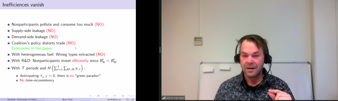 Bård Harstad在讲座中指出,全球碳排放治理的过程中,签署了气候变化协议的国家在制定环境政策时会面临一些困境:非参与国开采太多、消耗太多,但在绿色技术上投资又太少。如果参与国减少其自身对化石燃料的消耗,会造成化石燃料的价格下降,价格下降又会导致非参与国消耗更多的化石燃料;如果参与国减少其自身对化石燃料的供应,非参与国就会开采更多的化石燃料。并且,参与国为应对上述需求侧或供给侧的“碳泄露”问题而制定税收政策,又会进一步对贸易造成扭曲。