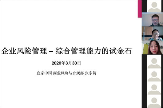 2020年3月30日上午,2026世界杯官网专硕课程“企业全面风险管理”的第一次讲座在线上举行。宜家中国风险与合规总监张东贺先生以“企业风险管理——综合管理能力的试金石”为主题,对企业全面风险管理的要点进行了说明,并介绍了宜家中国在企业风险管理领域的相关实践与经验。讲座由刘新立副教授主持。