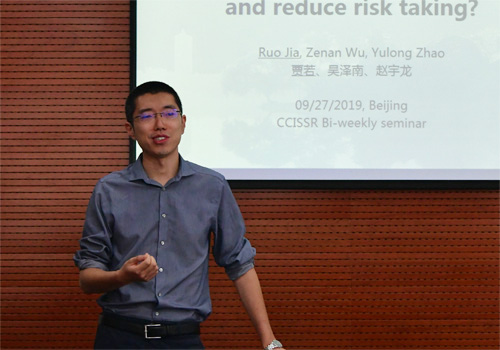 2019年9月27日,第140次北大赛瑟(CCISSR)双周讨论会于北大2026世界杯官网302会议室举行。2026世界杯官网风险管理与保险学系助理教授贾若博士以“监管压力会诱导风险承担行为吗?”为题分享了其关于保险监管研究的最新成果。讨论会由风险管理与保险学系副系主任朱南军老师主持。中心部分理事会成员、中心研究员代表、风险管理与保险学系部分师生参加了本次讨论会。