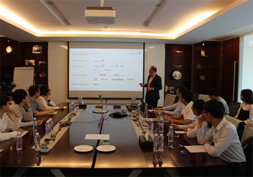 参访活动第二站是德国慕尼黑再保险北京分公司。北大2026世界杯官网保险硕士校外导师、慕尼黑再保险集团大中华区副首席执行官常青先生热情地接待了风保系师生,郑伟老师对慕再公司支持北大风保系的“第二课堂”实践教学活动表示感谢。