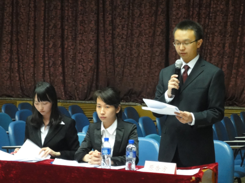 比赛分为初赛和复赛两个环节。初赛为晋级淘汰赛,比赛评委是由主办方和四支代表队邀请的主修法律的硕士研究生。按照民事诉讼普通程序,在法官的主持下,原被告双方代表队围绕案件争议问题进行了反复辩论,双方队员激烈交锋,几乎难分胜负。最终评委依据书面评分标准打分,人民大学代表队和中央财经大学代表队胜出,成功晋级决赛。