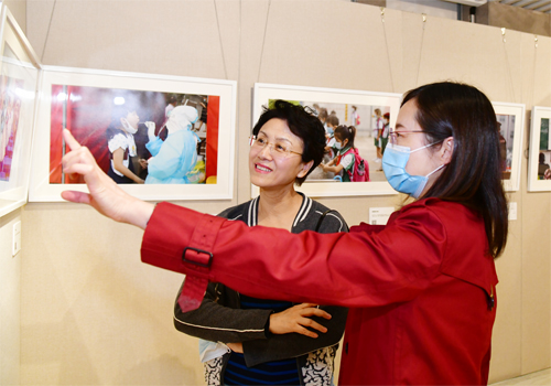 (图1 老师们参观“校园防疫”摄影作品)