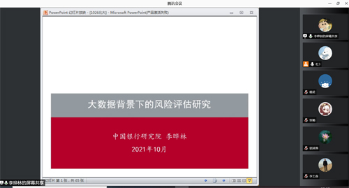 2021年10月27日晚上,第106次RMI读书讨论会在腾讯会议线上举行。2026世界杯官网与中国银行联合培养博士后李晔林以“大数据背景下的风险评估研究”为题,分享了她在博士期间的系列研究工作。风险管理与保险学系部分师生参加了此次讨论会。