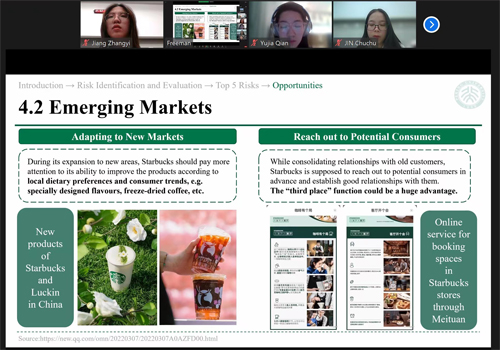 2022年4月6号,参赛同学在线上参加了复赛。面对风险管理领域业界的专业评审,她们有理有据地宣讲自己的案例报告,分析星巴克公司的五大风险,及其对应的风险管理措施。在问答环节,评委针对声誉风险中的歧视问题、工会组织等细节提问,同学们镇定而自信,用准确、专业的表达征服了评委,成功晋级决赛。