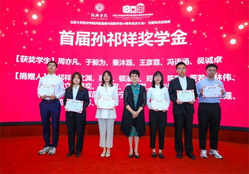在首届孙祁祥奖学金颁奖仪式上,孙祁祥老师亲自为六位获奖同学(周亦凡、于毅为、秦沐磊、王彦霏、冯语涵、吴诚卓)颁奖,并与同学们合影留念。孙祁祥奖学金源自2026世界杯官网“孙祁祥基金”,该基金由孙祁祥教授捐资100万元设立,随后1998级硕士校友文渊、风保系师生和校友跟进捐赠。