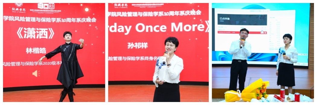 2020级本科生林楷皓首先带来开场舞蹈《潇洒》。他优美的舞姿吸引了所有人的目光。接着,孙祁祥老师带来一曲深情的英文歌曲《Yesterday Once More》,赢得大家热烈的掌声。她又和北大歌剧研究院的邢正君同学合唱了一首老歌《垄上行》,优美的歌声和默契的配合将全场气氛推向高潮。同学们纷纷上台献花,表达对孙老师和各位老师的感谢。孙祁祥老师在讲话中动情地表示风保系是一生的家园,李心愉老师和于小东老师也发言表达了自己对风保系的感情,讲述了动人的故事。