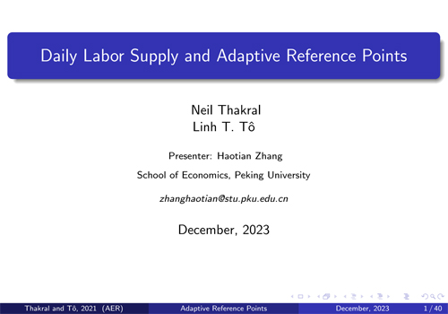 2023年12月22日12:00-13:30,第143次RMI读书讨论会于经院302教室举行。风险管理与保险学系2021级博士生张浩田分享了一篇2021年发表于American Economic Review的文章“Daily Labor Supply and Adaptive Reference Points”。风险管理与保险学系部分师生参加了本次讨论会。