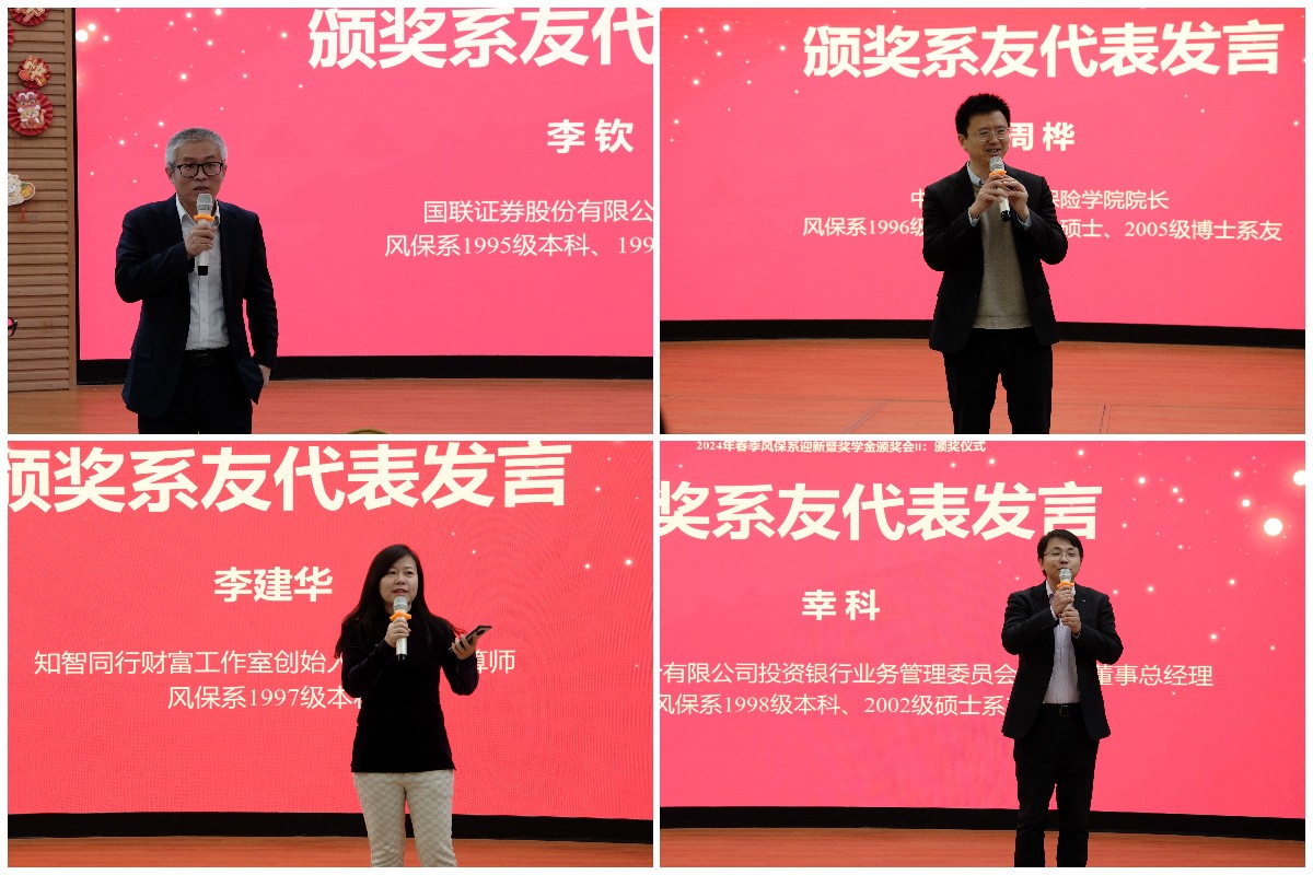接下来,捐赠系友代表与大家分享自己曾在风保系的感悟,并寄语在校同学。风保系95级本科、99级硕士系友,现任国联证券股份有限公司副总裁李钦回顾了在校时所见筚路蓝缕的创系时期,老师们尽其所能给大家提供最前沿的内容。他希望同学们培养终身学习的习惯,不断提升自我,以更好地适应未来的挑战和变化。