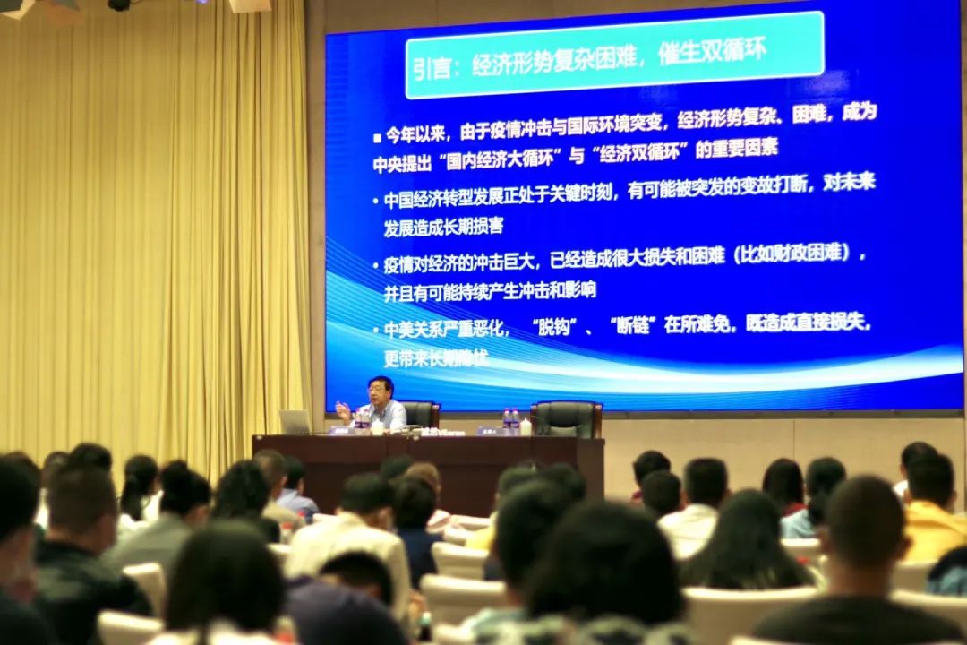 王跃生教授一行还在普洱市思茅区与普洱市领导会面,为普洱市政府机关干部和当地企业家共200多人作了“目前国内外经济形势与‘双循环’”的主题讲座,反响热烈。