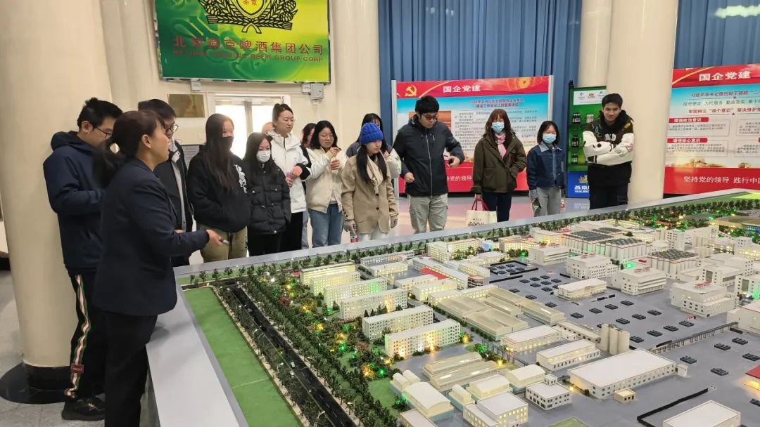 师生一行首先参观了公司的展示沙盘,了解了燕京啤酒的发展历程。燕京啤酒于1980年建厂,已经走过40余年的发展历程。燕京啤酒生物科技园集中了管理总部、研发与关键生产线,同时也是集啤酒生产、观光与品鉴等功能为一体的工业旅游景点。园区的每个酿造车间中有近80个发酵罐,以自动化控制系统调控发酵温度与流程。