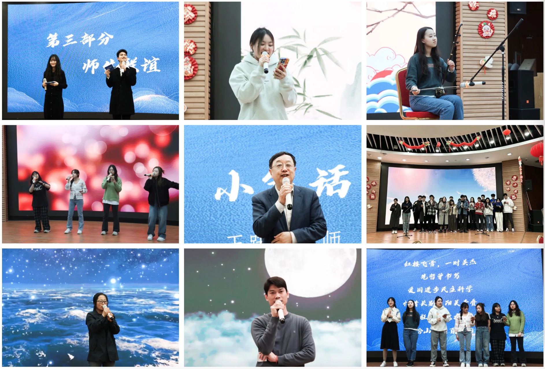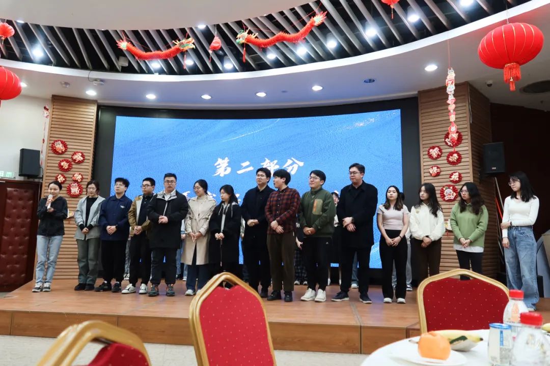 师生联欢会由2022级本科生滕玥和彭麟凯主持。2022级本科生屠婳演唱的《上春山》,复刻了春晚经典节目的精彩片段,为在场师生带来了融融春意;2021级本科生华姜楚楚带来的二胡演奏《山丹丹花开红艳艳》,悠扬的乐声浸润了在场师生的心灵;2022级本科生施彦如、陈诗尹、陈悦昀、刘凯羚共同为大家演唱《小手拉大手》,为大家送上了美好的祝福;车晓莹老师为大家带来歌曲《大海》,让全场师生仿佛置身于大海之滨,聆听海的声音;2020级本科生及2022级硕士生共同为大家带来歌曲《青春大概》和《稻香》,诉说着将与燕园作别的深情怀念与依依不舍;莫家伟老师带来歌曲《月半小夜曲》,经典的旋律和富有感染力的演唱引发全场师生的热烈掌声;王跃生老师为大家带来的小笑话则推动全场欢声如潮,让联欢会步入高潮;最后,师生共同合唱《燕园情》,重温“胸中黄河月”的情怀与“收拾山河待百年约”的豪迈,为联欢会画上了圆满的句号。