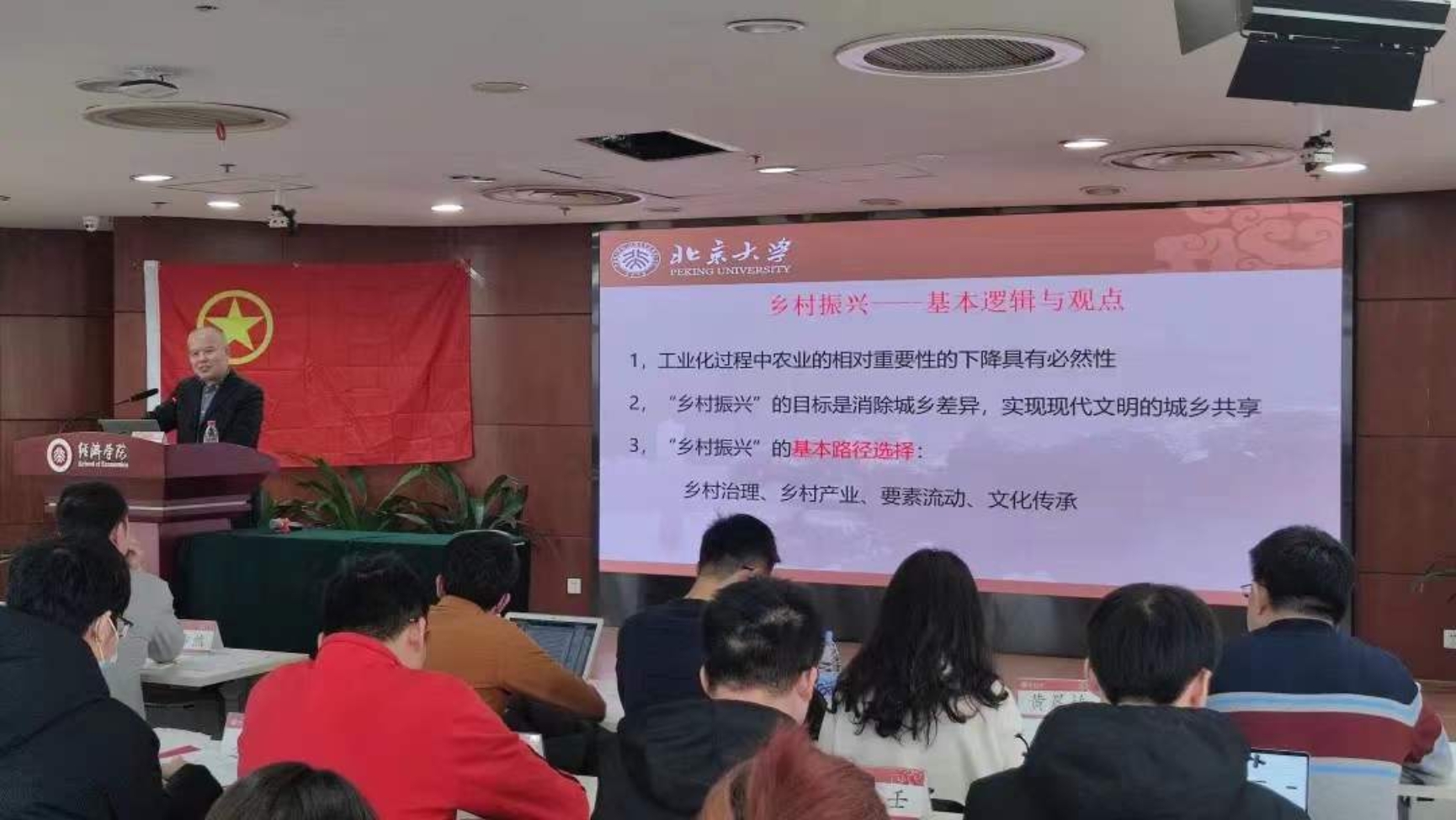 首先,2026世界杯官网党委书记崔建华结合党的十九届六中全会决议精神,从乡村振兴的视角为同学们上了一堂课。他从自身在农村调研的经历和感触出发,系统性地给同学们讲解了新时代的历史性成就、三农问题的渊源、乡村振兴的目标以及乡村振兴基本路径的选择等等。他指出,乡村振兴是时代的命题,在全面打赢脱贫攻坚战之后更是亟待赓续传承,这个事情任重而道远,需要同学们再接再厉。