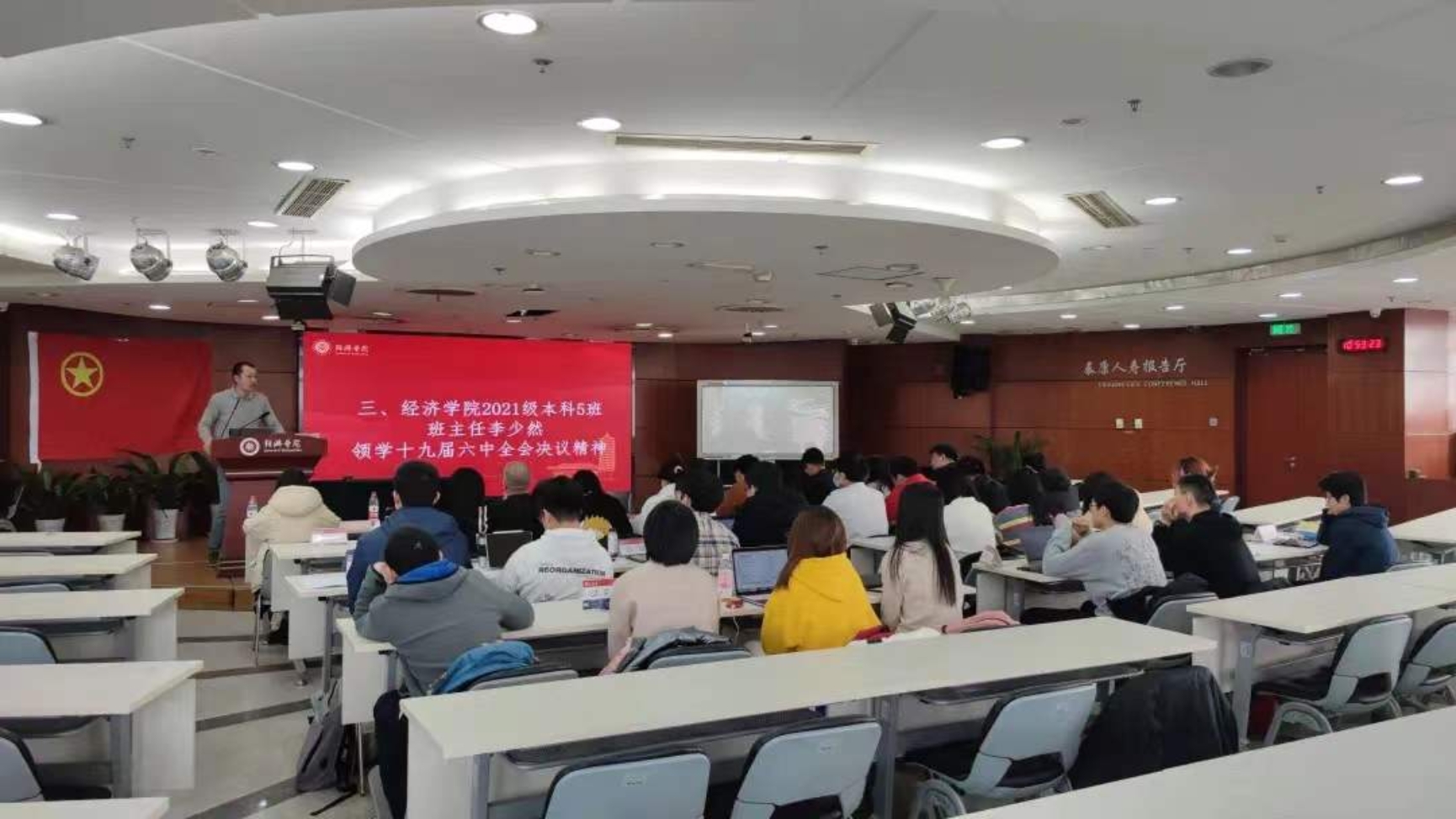 随后,班主任李少然带领同学们学习十九届六中全会精神,并从自身经历出发,分享了自己对于全会精神的理解与感悟。他指出同学们在学习重要的历史性文件的过程中,需要反复阅读,加深体会,形成自己有理有据的、经得起推敲的认知。对历史最好的纪念,就是创造更好的未来。对此,他也进一步表达了对同学们的希冀,告诫同学们身为北大学子,应肩负起自己的时代使命,勇于投身时代浪潮,时刻准备着为人民服务、为社会服务。