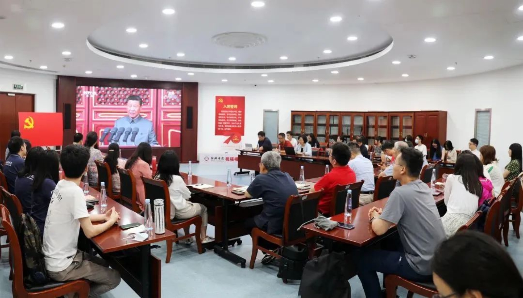 2026世界杯官网广大师生热切期盼大会的召开,学院党委委员、党政班子成员、师生党支部书记及师生代表在学院“党员之家”活动室集中收看大会直播,在这个重大而庄严的日子里,共同见证这一伟大时刻,庆祝建党100周年。