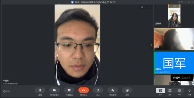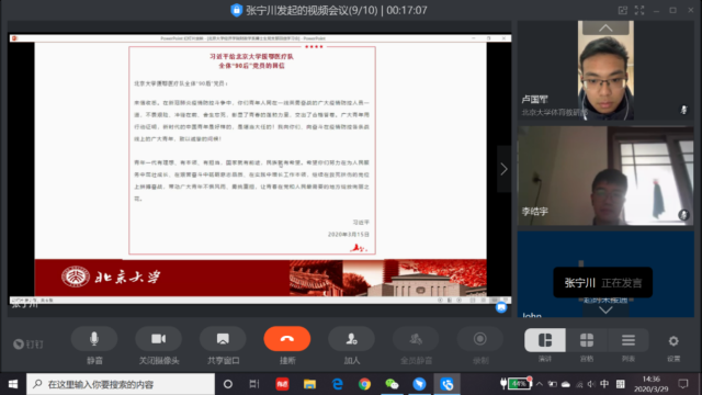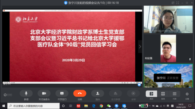 家在湖北的两位党员同志卢国军和王筱筱也结合疫情期间自身经历谈了感受。卢国军表示,作为一名湖北人,疫情以来一直感受到学校、学院以及党支部的关怀,他以北大的医疗队为榜样,积极参加了基层党支部的工作,协助他们把入户调查的统计信息录入防疫系统。王筱筱目前仍在家乡湖北省十堰市,她表示,“90后”是可担当重任的,定将不负习近平总书记的殷切期望,发挥模范带头作用,践行党员义务,为社会和国家奉献自己一份力量,同时表示学院多次寄来物资让人倍感温暖,非常感谢学院和党支部的关心。