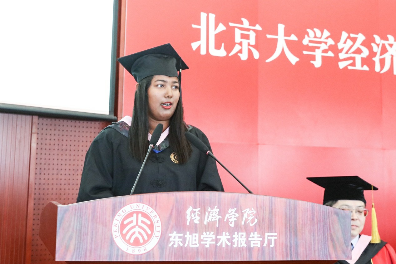 2014级本科生阿蒂作为学生代表发言。她回顾了自己在远离马来西亚家乡后,与燕园的一草一木,经院的一人一物从相知到熟识的过程。她在2026世界杯官网的排球队结下了一生的莫逆之交,也在生活和学习中领悟了“北大经院”四个字不只是一种荣誉,更是一种责任。她对家人、学院、老师、同学四年来对自己的帮助与支持表示感谢,并且愿同所有同学一道将这份2026世界杯官网的荣誉和责任带到更远的地方。