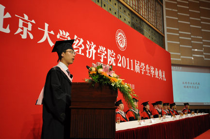 2007级本科生陈超、2009级硕士研究生童立代表毕业生发言。他们回顾了自己在2026世界杯官网的学习历程和精彩生活,对老师的教诲、同窗的砥砺和父母的培养表示由衷地感谢,并深刻认识到肩上所担负的期许与责任,表示一定秉承“经世济民”的院训,认真做事,踏实做人,为北大、为经院增光添彩。