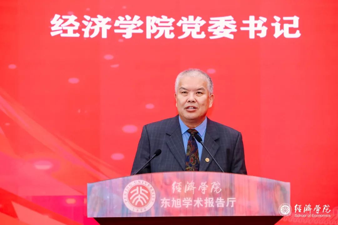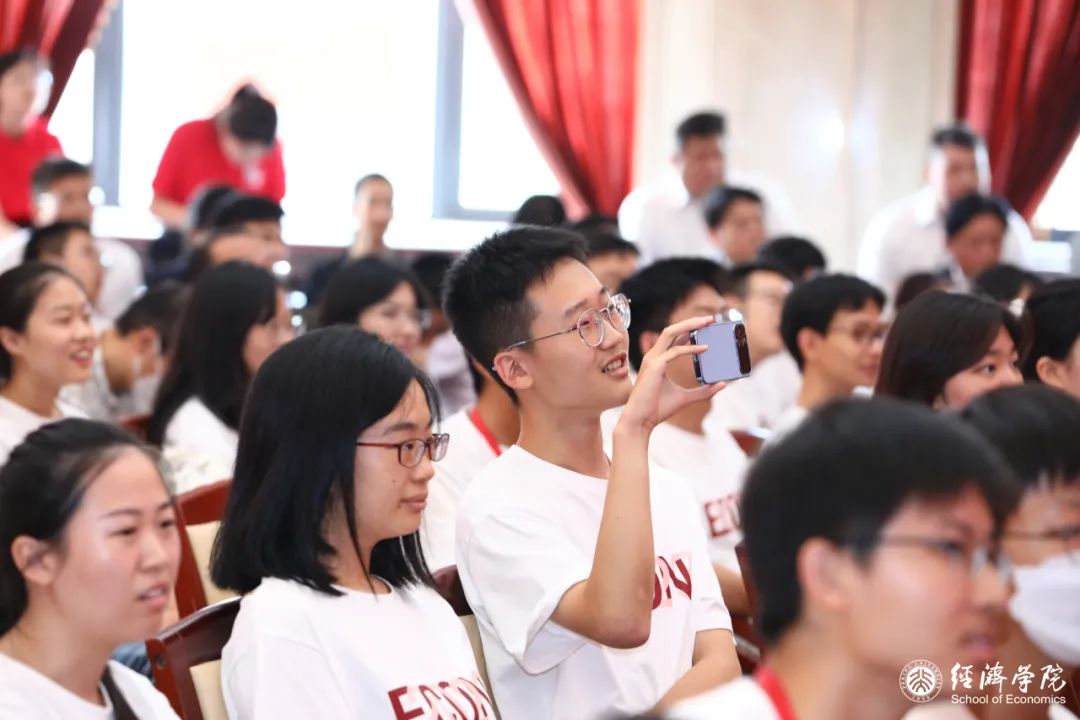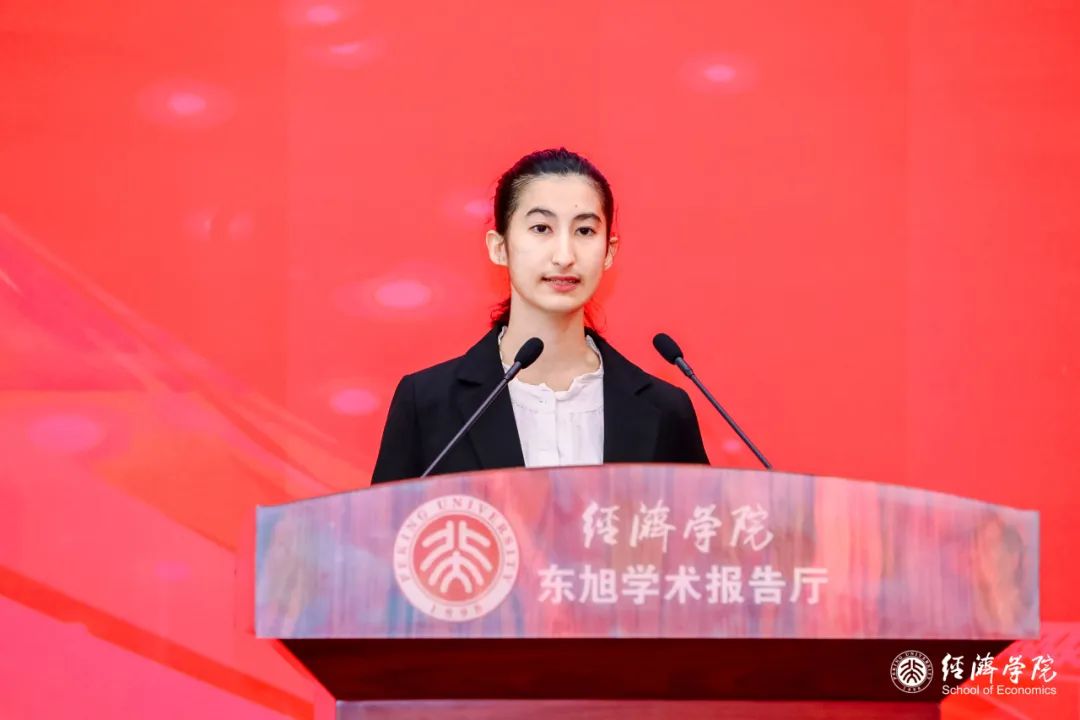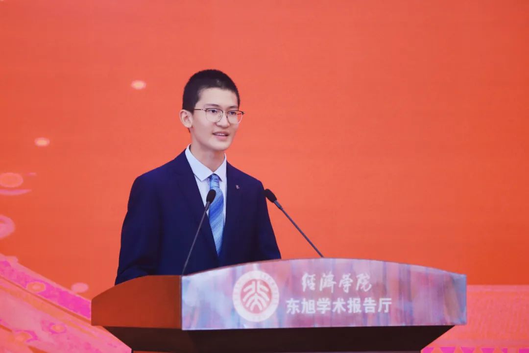 魏莱代表经院2023级本科新生发言,“父母希望我是他们的未来,但我更希望自己的未来能同祖国的命运联系在一起”。他谈到,无数的风景汇集成北大的气质,让他真正走近这个学校,走进未名湖的涟漪里。短短两周,他在生日会上感受到经院师生间的感情与温度,在天安门观礼台观礼升旗仪式中体悟心中正在升起的鲜艳的五星红旗和升起的永恒爱国初心。在接下来的四年大学生活中,魏莱希望自己和同学们的人生如诗如歌、梦想绚丽如虹、壮志海阔天空。