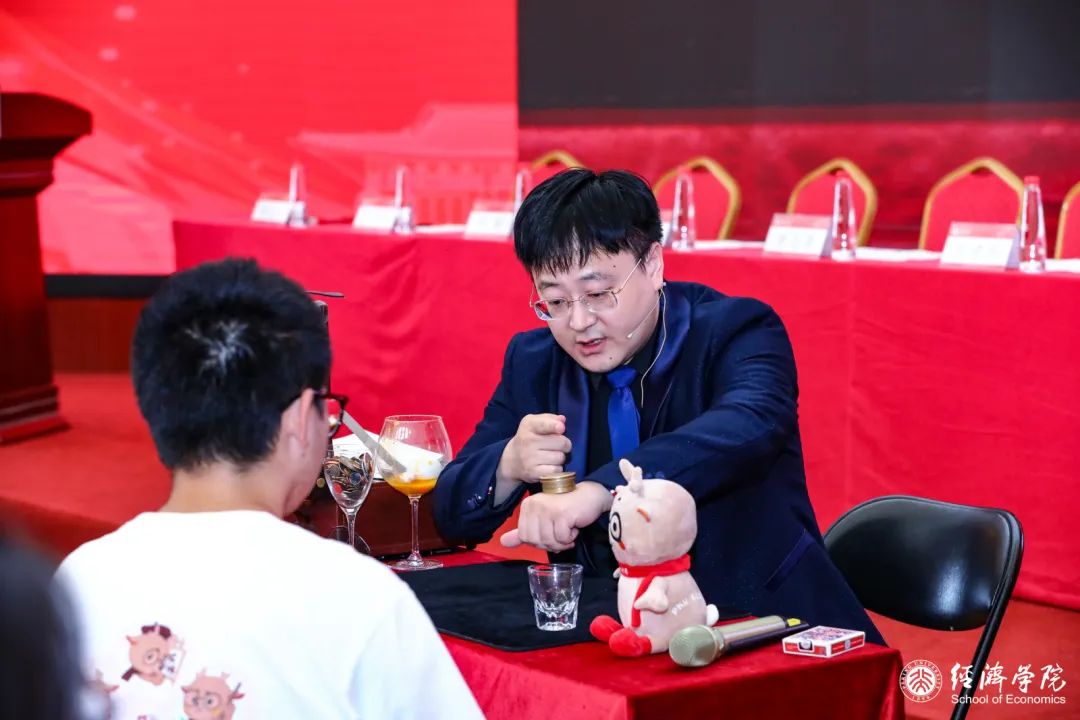 在暖场环节的最后,软件与微电子学院2017届校友辛冠杰带来魔术《欢迎你,新北大经院人》。从硬币到鸡蛋,从数字到地球, 魔法也让人相信——相信时间的积累,相信燕园的魔力,相信同学们和经院彼此都会成为最为重要的选择,相信大家的开学愿望一定可以实现,也相信同学们在北大的求学之路一定会收获满满。