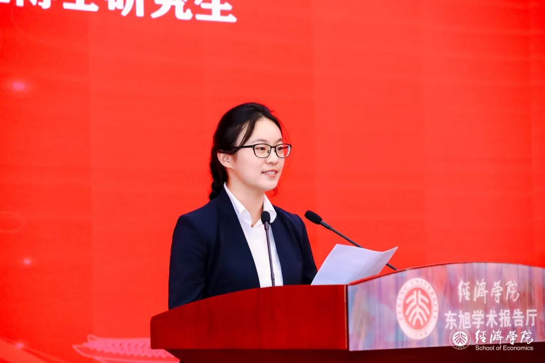 研究生新生代表、西方经济学专业博士研究生王祖依发言。王祖依借自己钟情网球的独特经历分享了她的三点感悟:锲而不舍比计较得失更重要,凝神专一比左顾右盼更重要,找准落点比尽情挥洒更重要。她希望能和同学们一起心无旁骛追逐梦想,“穿透遮眼的浮云,拥抱更广阔的天空、更遥远的山川”;聚焦主责主业,“立定脚跟、保持静气,用向内的积蓄在人生的画卷上画出最美的弧线”;永葆经世济民的求实底色,“找准所知所学和国家所需、人民所盼、未来所愿的结合点”,站在富民强国、建言献策的历史舞台前沿展鸿鹄之志。
